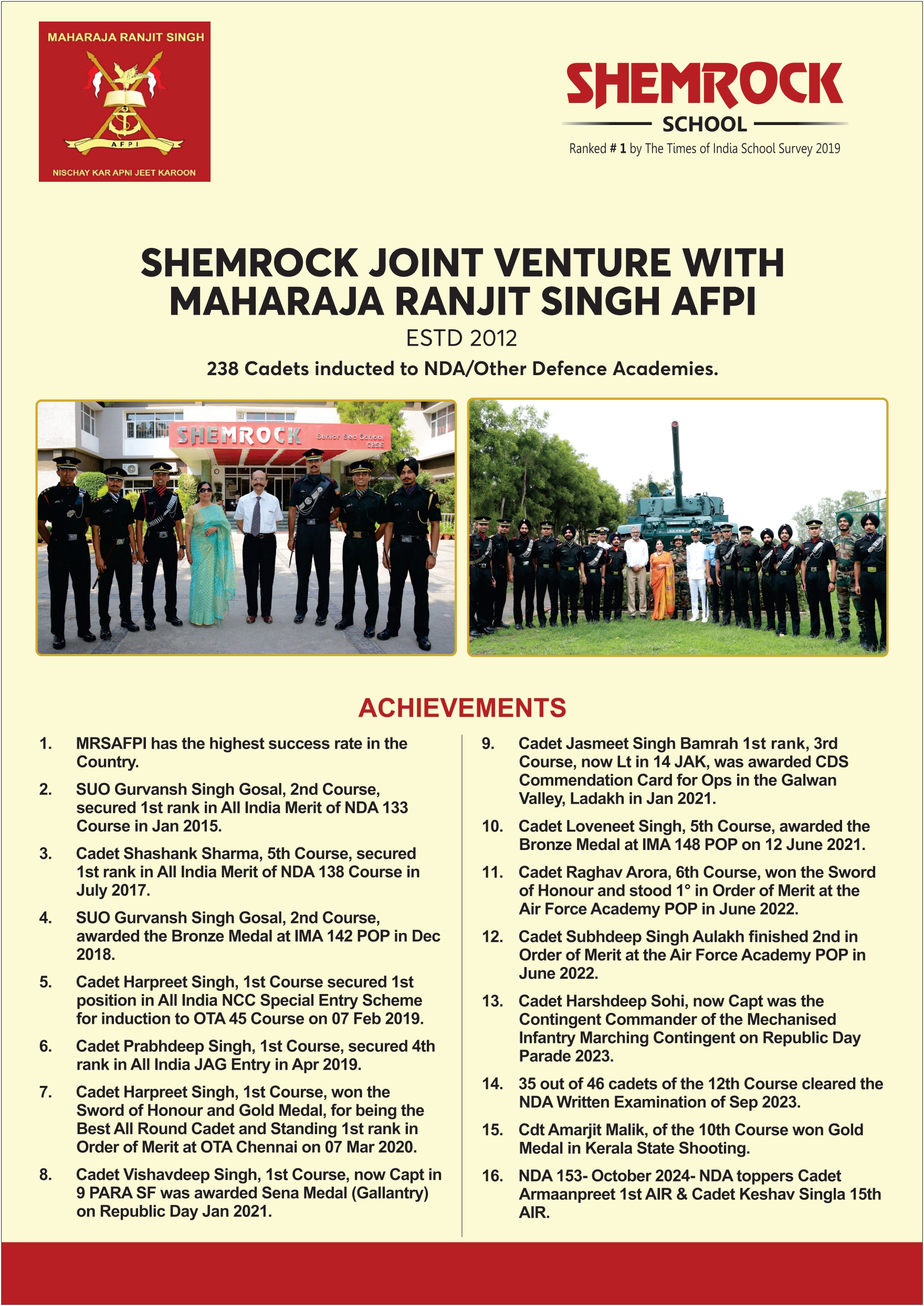 The Maharaja Ranjit Singh Armed Forces Preparatory Institute has been established by Government of Punjab in April 2011. The institute is designed to train 96 boys at any one time. To join armed forces these Cadets study class 11 and 12 (Non-medical) in Shemrock School, Sector 69, Mohali. AFPI Cadets do PT equivalent to 1st term NDA standards (Basic test), 2nd term standards (Higher test) and 3rd term standards (Excellence test). Drill is also taught at AFPI. All important games are played such as Hockey, Football, Basketball, Volleyball, Cross Country, Boxing, Lawn Tennis, Squash, Golf and Swimming. All training and administrative expenses are borne by the Government of Punjab. Cadets only have to pay school fees.